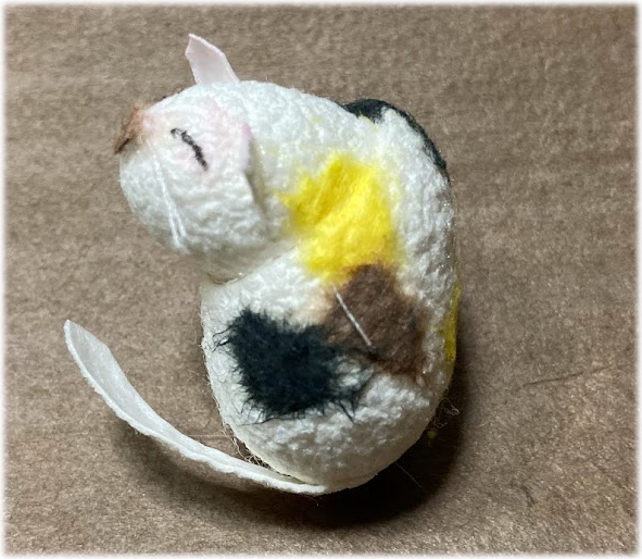 黄繭種の繭の中に小石丸で作った猫が入っています |