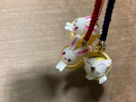| 鈴付きの根付 うさぎと猫があります。各1200円(税別) |